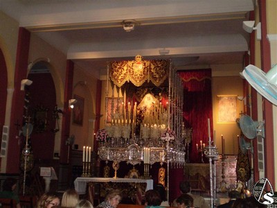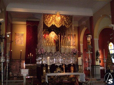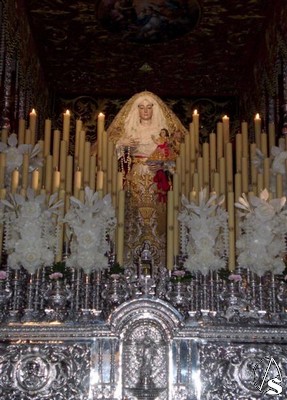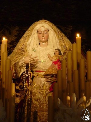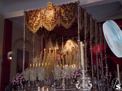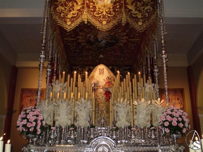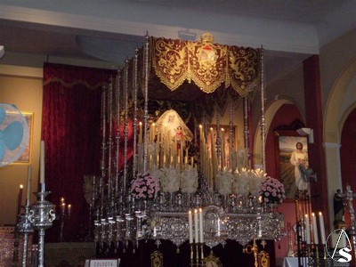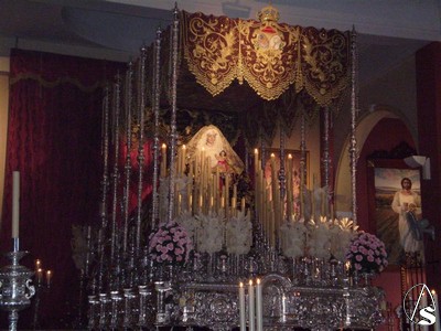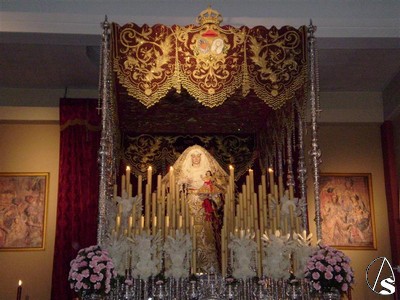 Para este triduo y como ya les informamos ayer la Virgen del Rosario se encuentra preparada en su paso de palio, el que utiliza en Semana Santa aunque de manera poco usual podemos verla bajo este palio también con la imágen del Niño Jesús.
