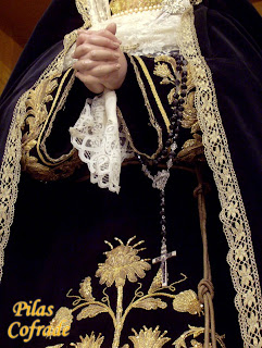 Con manto negro liso y la saya bordada del siglo XIX al igual que su corona de plata, se nos presenta la reina dolorosa, delicada y dulce y que pudorosamente, sabe llegar a lo mas hondo de todo aquel que se acerca a Ella a contemplarla y a rezarle, pues la Virgen de los Dolores, a pesar de ser una de la más desconocidas.... es muy de Pilas.