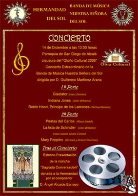 Arte Sacro. El domingo día 14 de diciembre a las 13:00 horas, en la parroquia de San Diego de Alcalá, tendrá lugar un concierto extraordinario de la Banda de Música Ntra. Sra. del Sol, cuyo programa está dedicado especialmente a los mas jovenes de la casa ya que se interpretarán las bandas sonoras de las películas más conocidas.