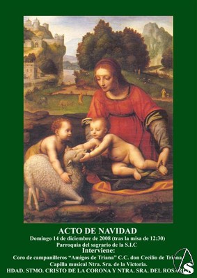 Arte Sacro. Hoy domingo 14 de diciembre, a la finalización de la misa de 12:30 horas de la parroquia del Sagrario, la Hermandad del Santísimo Cristo de la Corona realizará un "Acto de Navidad".