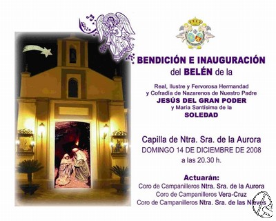Fernando Jesús Romero Triguero. La Capilla de Ntra. Sra. de la Aurora acogerá este próximo domingo, día 14 de diciembre, la bendición y posterior inauguración del Belén de la Real, Ilustre y Fervorosa Hermandad y Cofradía de Nazarenos de Ntro. Padre Jesús del Gran Poder y María Stma. de la Soledad, de la localidad sevillana de Los Palacios y Villafranca.