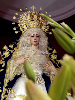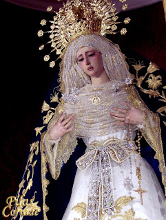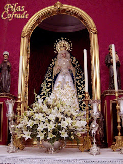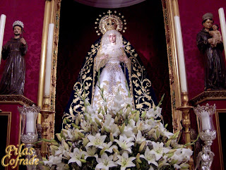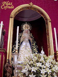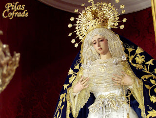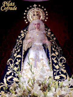 Pilas Cofrade. A principios de diciembre la bendita imagen de María Santísima en su Soledad de Pilas cambió sus atavíos propios del mes de los difuntos por el blanco y celeste inmaculado, luciendo manto bordado en oro en terciopelo azul que estrenase hace unos años y una saya blanca rematada por una cinturilla o fajín de brillantes, que ensalza aun más la realeza de la Santísima Virgen.