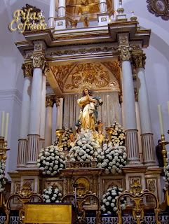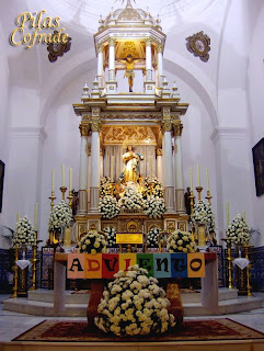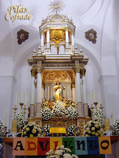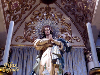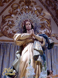 Pilas Cofrade. Con motivo de la festividad de la Inmaculada Concepción, la comunidad parroquial de Pilas celebró un solemne triduo a María Inmaculada, concretamente a la imagen de la "Inmaculada Grande" como es conocida, de talla y no de vestir, pues la imagen de la Inmaculada de candelero es la "pequeñita o purecita" que preside el altar del Corpus en el "Laberinto" cada año y que durante su estancia en la Parroquia acompaña en un lateral del altar de la capilla de la Inmaculada a la talla que hoy traemos a esta galería.