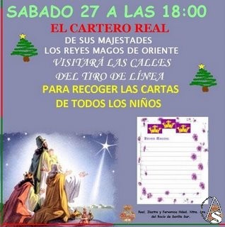 Arte Sacro. La Hermandad del Rocío de Sevilla Sur ha llamado al Cartero Real de sus Majestades los Reyes Magos de Oriente, y este recorrerá las calles del Tiro de Línea hoy, 27 de diciembre, a las 18,00 horas para recoger las cartas de todos los niños.