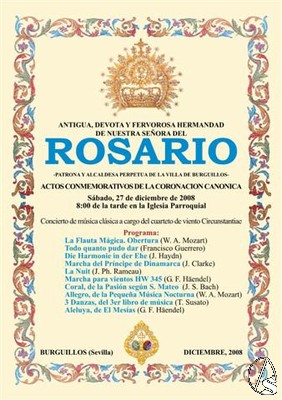 Arte Sacro. Dentro del programa de actos previos a la coronación canónica de Ntra. Sra. del Rosario, prevista para el próximo 16 de mayo de 2009, la Antigua, Devota y Fervorosa Hermandad de Nuestra Señora del Santo Rosario, Patrona y Alcaldesa Perpetua de la Villa de Burguillos (Sevilla), ha organizado un concierto de música clásica a celebrar en la Parroquia de Burguillos a las 8:00 de la tarde, el sábado 27 de diciembre, festividad de San Juan Evangelista (patrón de la Juventud), a cargo del cuarteto de viento "Circunstatiae", de Alcalá del Río, que interpretarán las siguientes obras:
