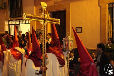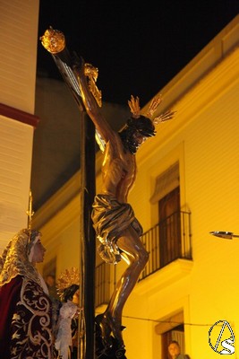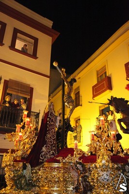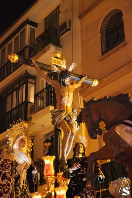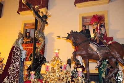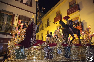 En la Calle Daoiz, pudimos contemplar la Hermandad de La Lanzada. El “Crucificado” -Señor de la Sagrada Lanzada-, junto con la Virgen de Guía, San Juan, Magdalena, María de Cleofás, María Salomé (restaurada), lónginos y el Caballo, componen el Misterio que de forma majestuosa efectuó estación de penitencia el miércoles Santo. Los sones de la Tres Caídas acompasaron su recorrido, solamente silenciado por la estrechez de la calle.