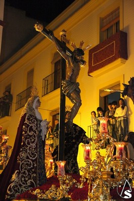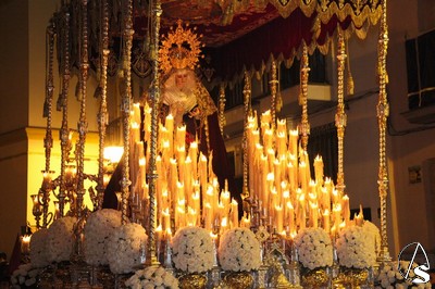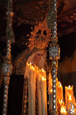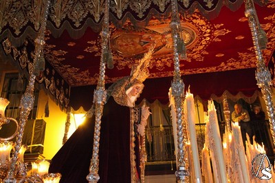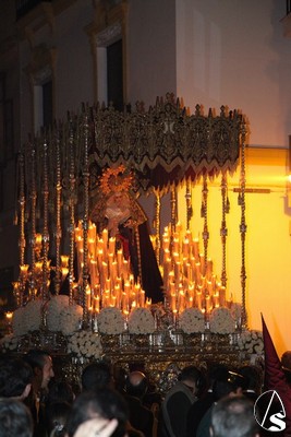 La Virgen del Buen Fin esmeradamente bella, afligida por el dolor de Jesús, continuó bajo Palio el camino de su hijo hasta la Parroquia de San Martín. Las marchas procesionales de la Filarmónica de Pilas le acompasaron en todo momento.