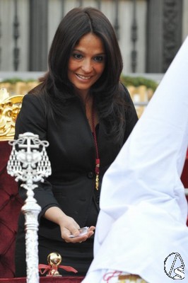 Un nazareno le ofreció unas estampas de sus titulares, agradeciéndoselo con la agradable sonrisa que la caracteriza.