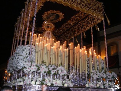 Los nazarenos seguían llenando la Plaza de España cuando apareció por la puerta de la Parroquia la imagen de Nuestra Señora de los Dolores Coronada, obra de Juan de Astorga de 1816, y que estuvo acompañada durante todo el recorrido por los sones de la Banda Municipal de Villalba del Alcor.
