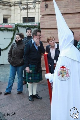 ¿Han visto alguna vez a un hombre con falda viendo cofradías? Pues gracias a nuestro amigo Fernando Sánchez lo podrán contemplar. Claro, se trata de un ciudadano escocés, pero observen lo atento que está ahí con su faldita de cuadros y sus calcetines de cuello vuelto...