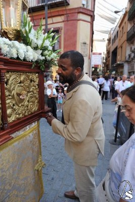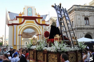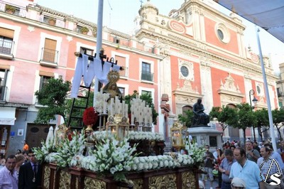 Daniel García Acevedo. Desde hace varios años la Cruz de Mayo de la barriada Nueva Sevilla, de Castilleja de la Cuesta , sale por las calles del centro de la ciudad paseando a la Santa Cruz y a Ntra. Sra. de los Ángeles. Este año no han podido efectuar la salida desde el convento de las Teresas, en el barrio de Santa Cruz, por obras y lo han hecho desde el Convento de la Encarnación , en la Plaza Virgen de los Reyes.