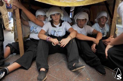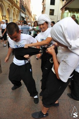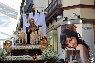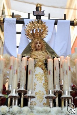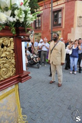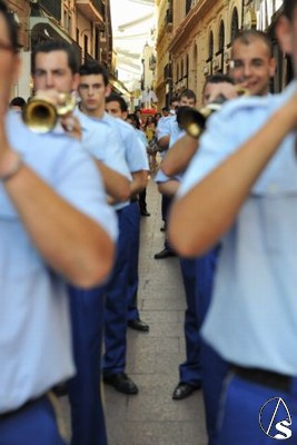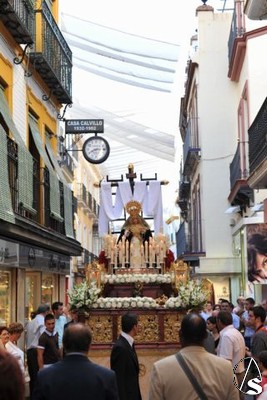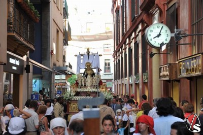 Numerosos chiquillos y chiquillas vestidos de costaleros abarrotaban el paso, perfectamente ataviados. El paso se iba moviendo a los sones de las marchas que interpretaba la banda de cornetas y tambores “Amor de Cristo” de San Juan de Aznalfarache, que también los pudimos oír en la Cruz de Mayo de Pasión y que tan grata impresión nos han causado en ambas procesiones. Combinan las composiciones clásicas con su repertorio particular e intercalando marchas de la banda de la Presentación al Pueblo de Dos Hermanas.