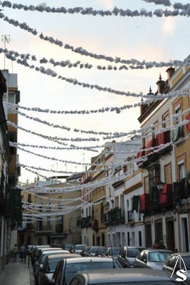 La calle Pureza aparece con casi todos los balcones adornados y con guirnaldas que atraviesan la calle.