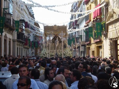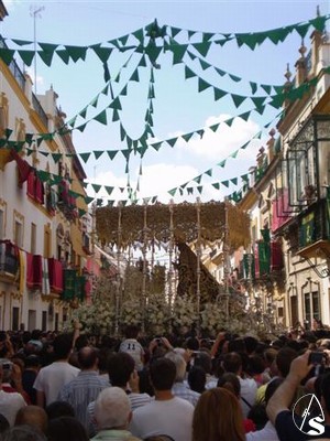 Desde Santa Ana a su capilla numerosas lluvias de pétalos desde los balcones, unos balcones que han lucido sus mejores galas durante esta efemérides.