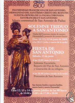 El sábado, 13 de junio, fiesta de San Antonio, a las siete de la tarde, comenzará la función de San Antonio, con la veneración de la reliquia y el reparto del Pan de San Antonio.