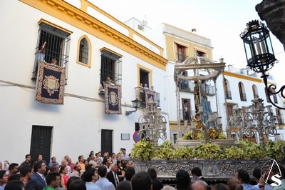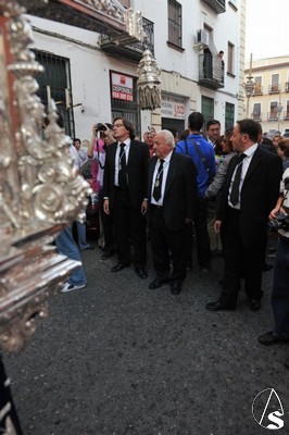 El paso iba a los mandos de la familia Ariza, sin Rafael que como todos ustedes saben decició retirarse del mundo del martillo a la entrada de la Soledad de San Lorenzo, y la banda de música de Ntra. Sra. del Carmen de Salteras puso las notas musicales como lo pondrá esta tarde en la procesión de vuelta a San Julián que comenzará a las 20,00 horas con el siguiente itinerario: Plaza de San Francisco, Manuel Cortina, Villegas, Cuesta del Rosario, Ángel María Camacho, Alfalfa, San Juan, Sales y Ferré, Plaza del Cristo de Burgos, Plaza de San Pedro, Doña María Coronel, Bustos Tavera, San Marcos, Vergara, Hiniesta, Lira, Duque Cornejo y San Julián, con entrada a las 00,00 horas.