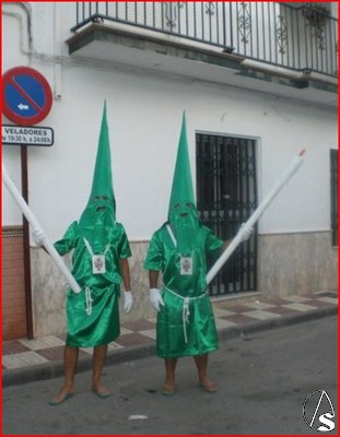 Pues cual es la sorpresa de la fotito y el video que me ha llegado al correo electrónico de un supuesto nazareno, que elegantemente aparece con el hueco de la boca abierto, además del de los ojos, en la diana de la Hermandad de la Vera Cruz de Albaida del Aljarafe (promovida por una HERMANDAD) con motivo de las Fiestas de su virgen. Resulta que en esa diana la gente además de disfrutar y celebrar el día de la salida de su Virgen, suelen ir algunos disfrazados, y este año acertadamente de NAZARENOS.
