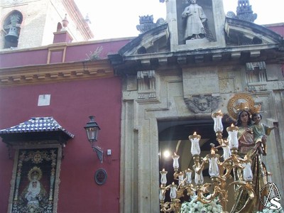 De las tradicionales procesiones de la Reina del Monte Carmelo en Sevilla nos quedamos con dos imágenes, una la nueva ráfaga que el taller de orfebrería Maestrante realizó para la Virgen del Carmen de San Gil.