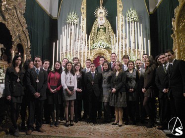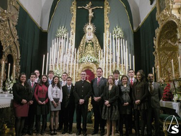 Antonio Rendón. El grupo joven de la Antigua, Real Ilustre y Fervorosa Hermandad y Cofradía de Nazarenos del Stmo. Cristo de la Ver-cruz y María Stma. de las Angustias Coronada, de la Sevillana Localidad, mariana de Alcalá del Río, establecida canónicamente, desde su fundación en la Real Ermita de San Gregorio de Osset de esta villa, juraron sus cargos, delante de sus titulares, dentro de los cultos de novena en honor a la Stma. Virgen de las Angustias Coronada, en el cual el Rvdo. Fernando Reyes Rico, director espiritual de esta Hermandad , bendecía las cruces con el cordón (emblema de la corporación alcalareña), mientras el hermano mayor de la Vera-cruz alcaraleña , José Eduardo Romero Fernández, iba colocando el cordón con la insignia de la hermandad , y un beso de bienvenida , a cada miembro de la junta joven.
