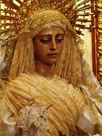La virgen está vestida con una saya”torera” como se suele decir, el torero que donó a ésta hermandad del Miércoles Santo su traje fue Diego Puerta.