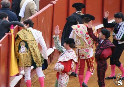 Arte Sacro. La Esperanza Macarena y la de Triana estuvieron presentes el pasado lunes en la 12ª corrida del abono sevillano en la Real Maestranza, en sendos capotes de paseo que sacaron Julio Aparicio y Cayetano Rivera Ordóñez respectivamente.