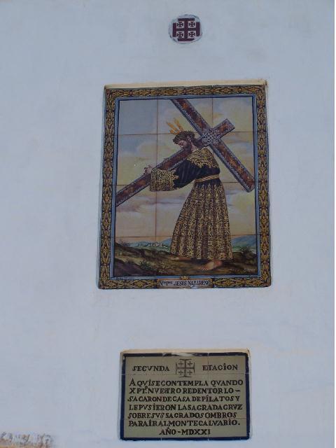 2ª Estación. Se encuentra el la calle San Esteban nº 2, junto a la plaza de Pilatos y es un azulejo del Nazareno del Silencio, siendo unos de los pocos azulejos originales que quedan del año 1957.