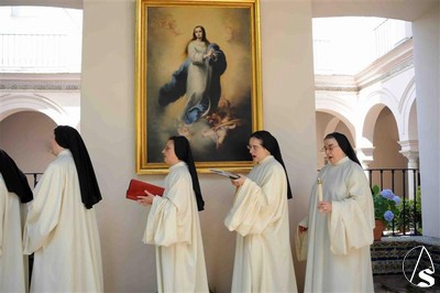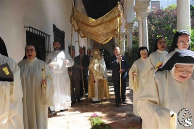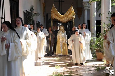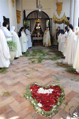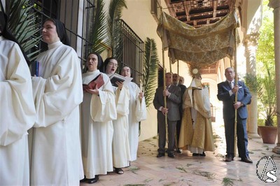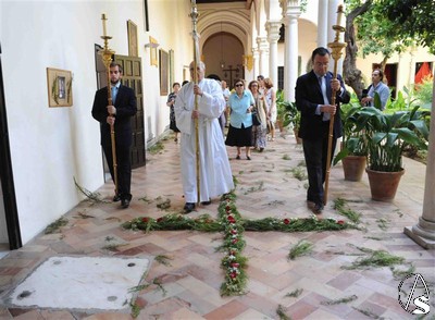 José Luis Martínez. Cumpliendo con su compromiso estatutario de vinculación y colaboración preferente con la parroquia, las hermandades del barrio de la Macarena, donde está su sede social, y con los conventos sevillanos, la Asociación cultural-cofrade Spes Nostra asistió el pasado domingo a la misa y procesión conventual del Corpus de San Clemente, que se desarrolló, como es habitual, por el claustro del primitivo covento hispalense, profusamente exornado por las monjas con altares y flores, configurando emblemas eucarísticos, hechos con pétalos y ramas, que alfombraban el recorrido del Santísimo bajo palio. Varios miembros de la Asociación participaron en el intimista cortejo.