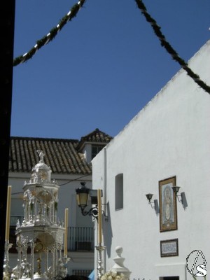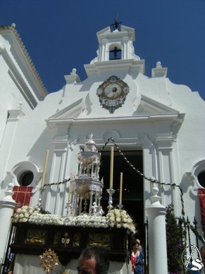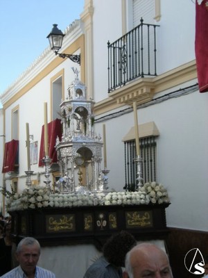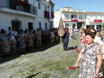 Aproximadamente a las 10:30 horas de la mañana, el Santísimo salía por las puertas de la Parroquia entronizado en su Custodia de plata y se encontraba con un pueblo volcado ante su presencia, calles alfombradas de juncia y romero, altares, balcones adornados y sobre todo, todo el amor de su comunidad.