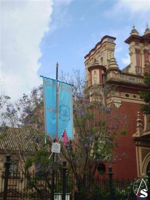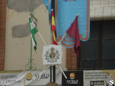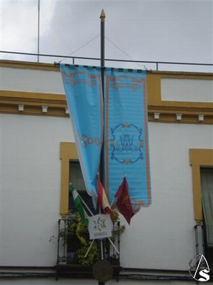 Ayer jueves ya se podían ver algunos gallardetes celestes con banderas y el escudo de la Hermandad colocados en algunas calles por las que esta previsto que pase la procesión.
