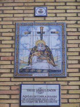 13ª Estación. Se encuentra en la calle Luis Montoto junto al Templete de la Cruz del Campo y el azulejo refleja al Stmo. Cristo de la Misericordia y Ntra. Sra. de la Piedad de la Hermandad del Baratillo.