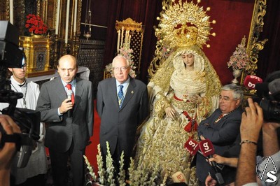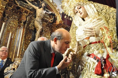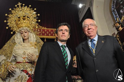 Francisco Santiago. Los dos equipos de futbol de nuestra ciudad, el Real Betis Balompié y el Sevilla F. C., jugaron su mejor partido el pasado 7 de octubre cuando sus presidentes impusieron la insignia de sus respectivos clubs a María Santísima del Rosario de la Hermandad de Monte-Sión.