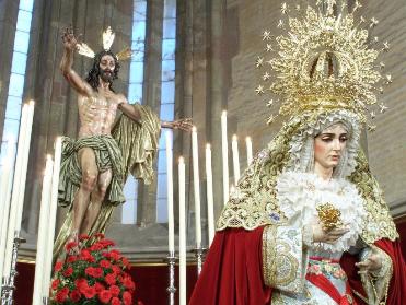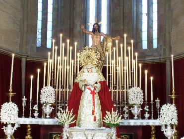 Les mostramos unas fotos del montaje del Altar de cultos en el que se aprecia al Señor Resucitado tras la Virgen de la Aurora.