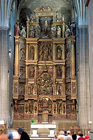 Este retablo renacentista posee esbeltas proporciones y su estructura se adapta a los tres planos del ábside: un cuerpo central, dividido en tres calles, y dos alas-calles oblicuas. En sus cinco calles se desarrolla el programa escultórico: los relieves se sitúan en las calles impares y en las calles pares las esculturas exentas de los santos protectores de epidemias (San Roque y San Sebastián) y otros relacionados, posiblemente, con las devociones particulares de los patronos o del cabildo. El programa iconográfico del conjunto está dedicado a la vida de Jesús, destacando las escenas de la Última Cena, el Lavatorio y el Árbol de Jesé. Sus soportes son columnas con capiteles de estilo compuesto y fustes acanalados, algunos con el tercio inferior tallado. Se completa el repertorio plástico con una exquisita y delicada decoración en la que predominan los grutescos, las figuras de atlantes y querubines, las cartelas, etc.
