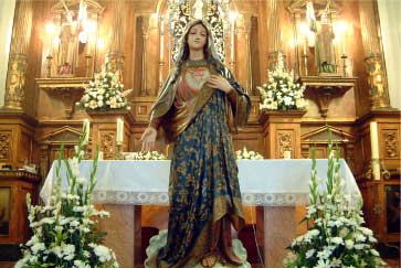 Se representa en su iconografía tradicional, aunque los colores son característicos de las fábricas realizadas en los talleres de Olot; túnica bermeja, manto en tonalidades azules, toca en blanco y en el centro del pecho un corazón, que confiere el dato característico de su iconografía.