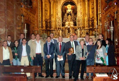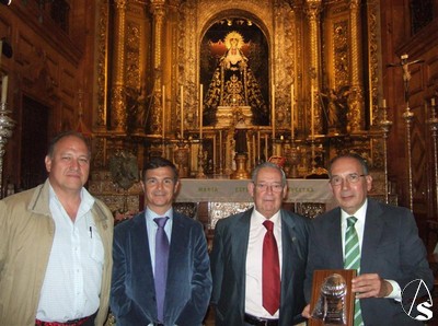 El Hermano Mayor, Manuel García, el Fiscal, Miguel Ángel Vaz (Anestesista de los Equipos de Trasplantes de Sevilla) y el Capataz de la Virgen, Antonio Santiago, entregaron al Dr. Pérez Bernal un original costal como recuerdo de esta Mesa Redonda y un recuerdo inolvidable de la Virgen a cada participante.