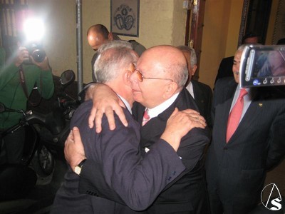 A las 20.30 horas llegaba el pregonero al Consejo de Cofradías para atender a los medios de comunicación. Antes fue recibido por la Junta Superior y por los consejeros que se encontraban, tanto de penitencia -exceptuando al delegado del Miércoles Santo, Mateo Domingo Gónzalez Gago, que no pudo estar presente y que por tanto no votó-, como de glorias y sacramentales, “Adolfo, vengo de la Macarena, así que… ¿Cómo crees que vengo?” Con estas palabras comenzaba el saludo del presidente y gran amigo de designado justo en la puerta del Consejo. Allí también le esperaban el hermano mayor de la Cena, Eduardo García, el de los Estudiantes, Antonio Piñero, y el ex también de los Estudiantes, Antonio Gutiérrez de la Peña. Excusó su presencia el de la Macarena, Manuel García, al encontrarse fuera de Sevilla.