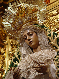 Pero lo que sí es seguro que todo sería esplendoroso y sublime, acorde a Su grandeza. Flor sobre flor aumentando sus aromas primaverales, porque da igual la fecha que fuera, pero ahí estaba presenta la jubilosa alegría de la primavera. Porque Ella es primavera sagrada en flor, que resuma hermosura a raudales. Las brisas irían en busca de sus más intensos y dulces perfumes, para adornar el aire que viera por vez primera la que es bendita entre las mujeres. Colores aterciopelados para un manto de cielo recién confeccionado por ángeles de las alturas, ansiosos de poder sentarse a las plantas de su protectora. Por la mañana el sol, con hilo nuevo, bordaría su dulce nombre: María. Por la noche la luna, con hilo de plata fina, bordó su maternal nombre: La Madre de Dios y, en la soledad y la paz de una madrugada convertida en canción de cuna, dulce susurro de nana, alguien con hilo de seda grana y en el nombre del Padre, del Hijo y del Espíritu Santo, derramó sobre ese manto de cielo bordado la confirmación de su nombre: Regla de los Panaderos.