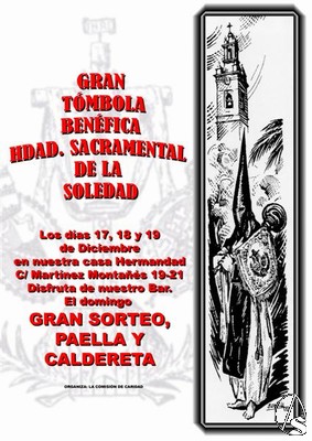 Arte Sacro. El viernes 17 de diciembre por la tarde comenzará la tómbola benéfica organizada por la Hermandad de la Soledad de San Lorenzo y se prolongará durante todo el sábado y el domingo, teniendo lugar el sorteo de los premios más importantes el domingo por la tarde, tras disfrutar de una gran paella y una caldereta servida por las hermanas a mediodía en el bar, instalado para la ocasión.