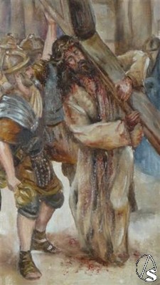 4. María encuentra a Jesús cargado con la Cruz (Vía Crucis, 4ª Estación): es la escena más dramática de todas, y como tal presenta un tratamiento más realista, con una marcada estética cinematográfica, evocando las grandes producciones bíblicas de los años cincuenta (Ben Hur, Los Diez Mandamientos, etc.) y de la película La Pasión, de Mel Gibson. Cristo porta la Cruz, la Vera Cruz, en presencia de su afligida Madre, con romanos ataviados con exhaustivo rigor historicista y una multitud que insulta y que grita a Nuestro Señor.