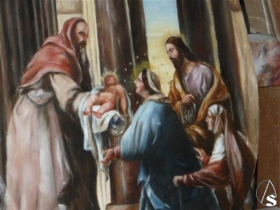 1. La Profecía del anciano Simeón (Lc. 2, 22- 35): Aparece la Virgen entregando al anciano Simeón el Niño Jesús, en presencia de la Profetisa Ana y de San José, que porta la jaula con dos tórtolas. Dicha escena se desarrolla en un marco arquitectónico imaginario que evoca el Templo de Vesta y el Arco de Septimio Severo, ambos del Foro Romano.