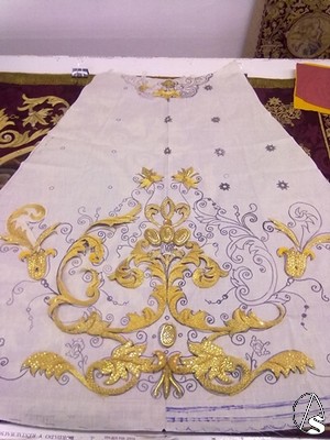 Nacho Baratillero. En el taller del bordador astigitano Jesús Rosado Borja, se esta procediendo en los últimos días, a la terminación de una nueva saya para Mª. Stma. de la Caridad en su Soledad.