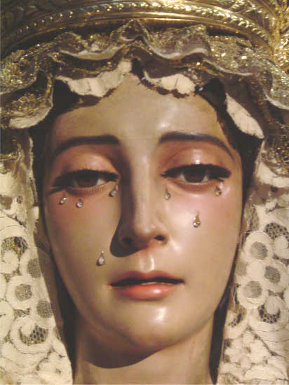 Es una Madre, Nuestra Madre y una Señora, Nuestra Señora...Y es la carga de nuestros pecados en Jesús lo que la hace llorar. Es un dolor roto, que ya no cesará en la Eternidad. Lágrimas divinas en un tiempo absoluto, que en un tiempo remoto hallaron sentido en el yugo de la humanidad y que no cesa hoy en día.