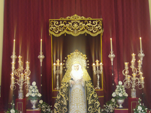 El besamanos fue muy sencillo, os lo describimos: cortina de damasco roja de fondo, con un dosel. Bajo dicho dosel el trono de la Hdad de la Esperanza de Triana que se lo dejo para la ocasión, saliendo de él una pequeña escalera, a los laterales del trono se encontraba dos candelabros del paso de San José Obrero, dos candelabros de mas pequeña altura y 4 ciriales. A los laterales de la virgen se podía contemplar 2 pies con jarras de flores y dos candeleros con una vela rizada casa uno.