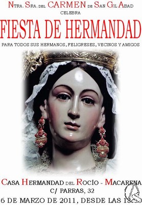 Arte Sacro. La Hermandad de Ntra. Sra. del Carmen de Sab Gil, celebrará el próximo domingo día 6 de marzo de 2011, desde las 13:00 horas en la casa Hermandad del Rocío Macarena, una fiesta y convivencia para todos sus hermanos, feligreses, vecinos y amigos de esta Hermandad que será destinada a la bolsa de Caridad de nuestra Hermandad.