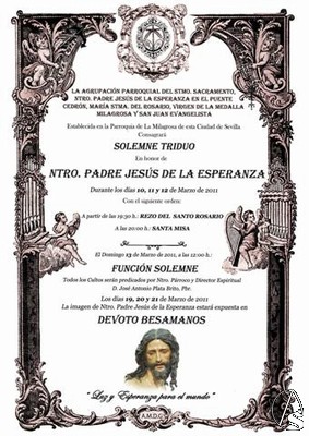 Arte Sacro. La agrupación parroquial del Stmo. Sacramento, Ntro. P. Jesús de la Esperanza en el Puente Cedrón, María Stma. del Rosario, Virgen de la Medalla Milagrosa y San Juan Evangelista, establecida en la parroquia de la Milagrosa, sita en la avda. de Ciudad Jardín, consagra solemne triduo en honor de Ntro. P. Jesús de la Esperanza, durante los días 10, 11 y 12 de marzo con el siguiente orden: