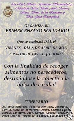 Arte Sacro. El próximo viernes 8 de abril, a partir de las 21:30h de la noche, tendrá lugar el I Ensayo Solidario por parte, tanto de la cuadrilla de Ntro. Padre Jesús Cautivo como de la cuadrilla de María Stma. de los Remedios.