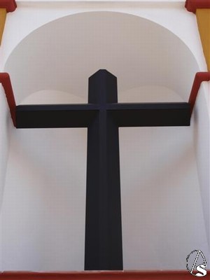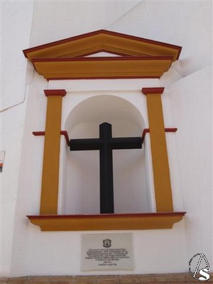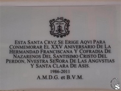 En cuanto al Monumento se trata de una Cruz de forja colocada en una hornacina. Bajo ella una placa donde podemos leer: "Esta Santa Cruz se erige aquí para conmemorar el XXV Aniversario Fundacional de la Hermandad Franciscana y Cofradía de Nazarenos del Santísimo Cristo del Perdón, Nuestra Señora de las Angustias y Santa Clara de Asís. 1986-2011. A. M. D. G. et B. V. M.". La Cruz fue bendecida por el Director Espiritual de la Hermandad, Rvdo. Sr. D. Ignacio Jiménez Sánchez-Dalp en un acto sencillo y rápido ya que la lluvia estuvo presente esa mañana en Alcalá de Guadaíra.
