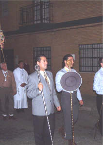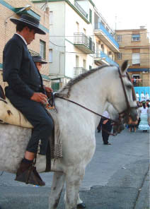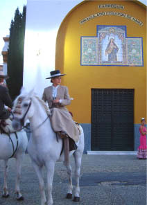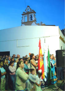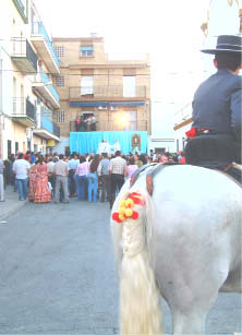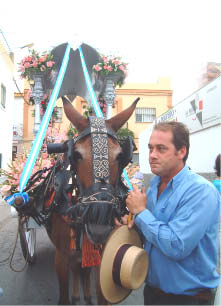 Posteriormente, el traslado del Simpecado a la carreta, la que utilizó al hermandad del Cerro en el Rocío y que hoy estrenaba la corporación con el tiro por mula. Se va formando el cortejo, caballistas, representaciones oficiales, Ayuntamiento y Distrito, Partido Popular, de la vecina hermandad del Cautivo y del Consejo de Cofradías.