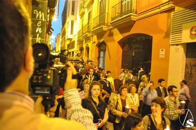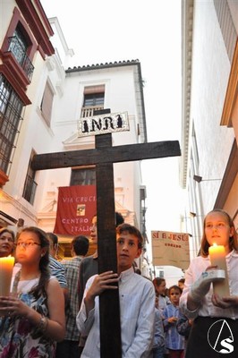 Este año el vía crucis ha tenido un sentido más juvenil, debido a la celebración en agosto de las JMJ de Madrid, por lo que el piadoso acto estuvo acompañado por los alumnos y profesores del colegio “Itálica” de la calle Arguijo.