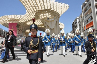 Posteriormente y en formación la banda fue la primera en pasar por las Setas, antes de comenzar su acompañamiento musical a La Borriquita.